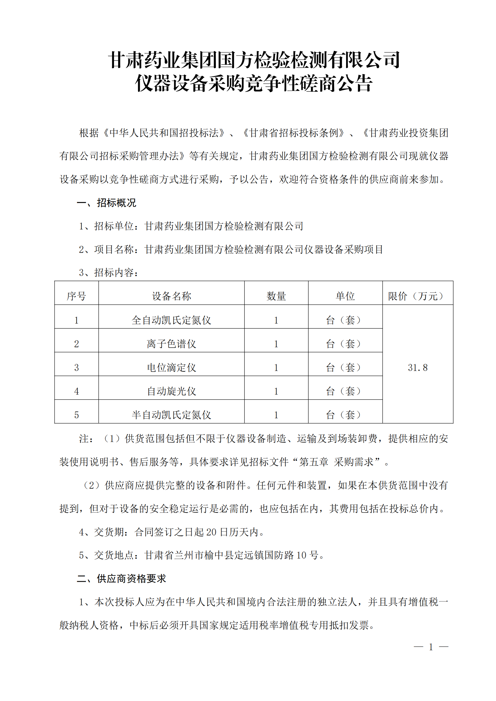 甘肅藥業(yè)集團(tuán)國方檢驗檢測有限公司儀器設(shè)備采購競爭性磋商公告