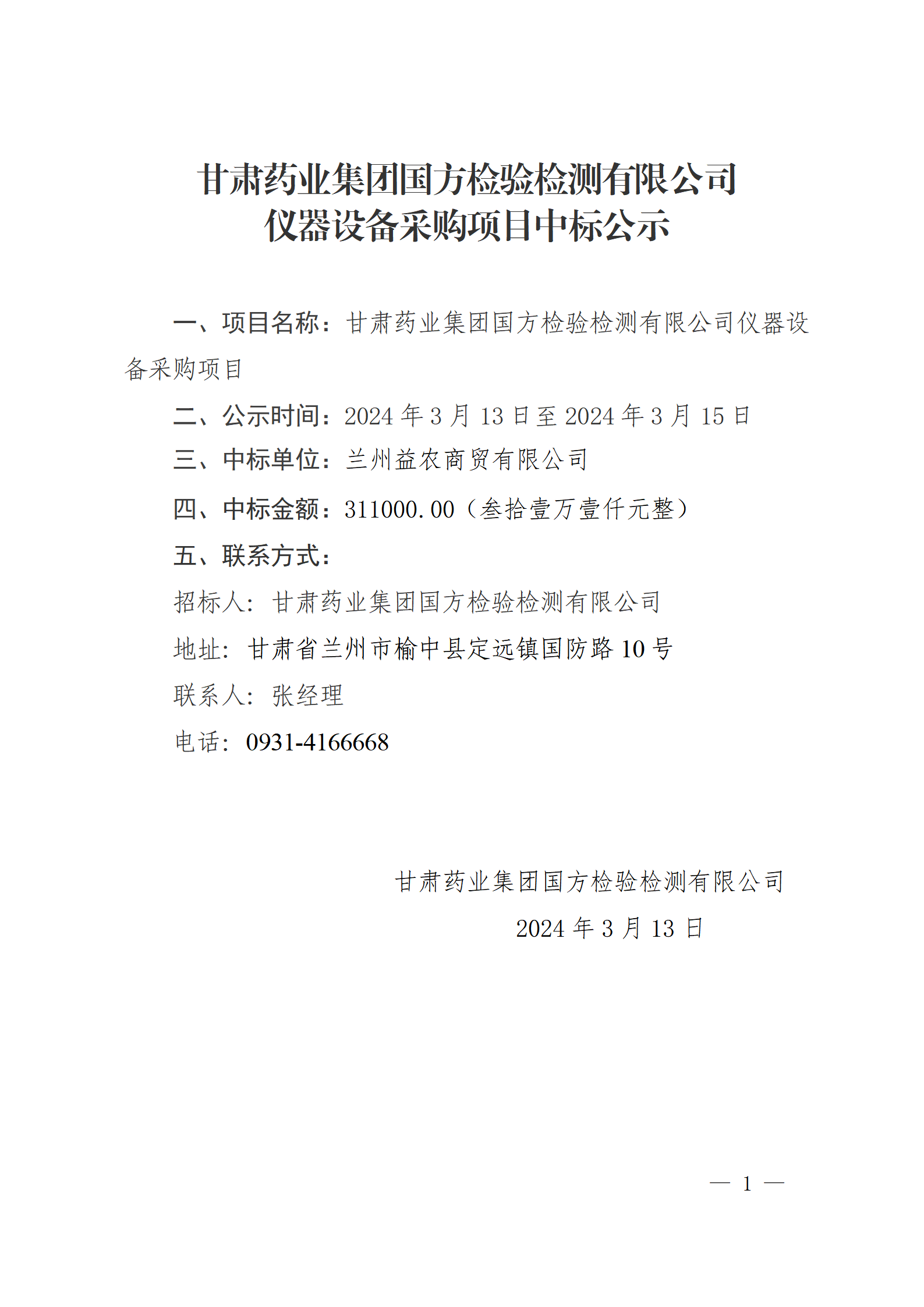 甘肅藥業(yè)集團(tuán)國方檢驗(yàn)檢測有限公司儀器設(shè)備采購項(xiàng)目中標(biāo)公示
