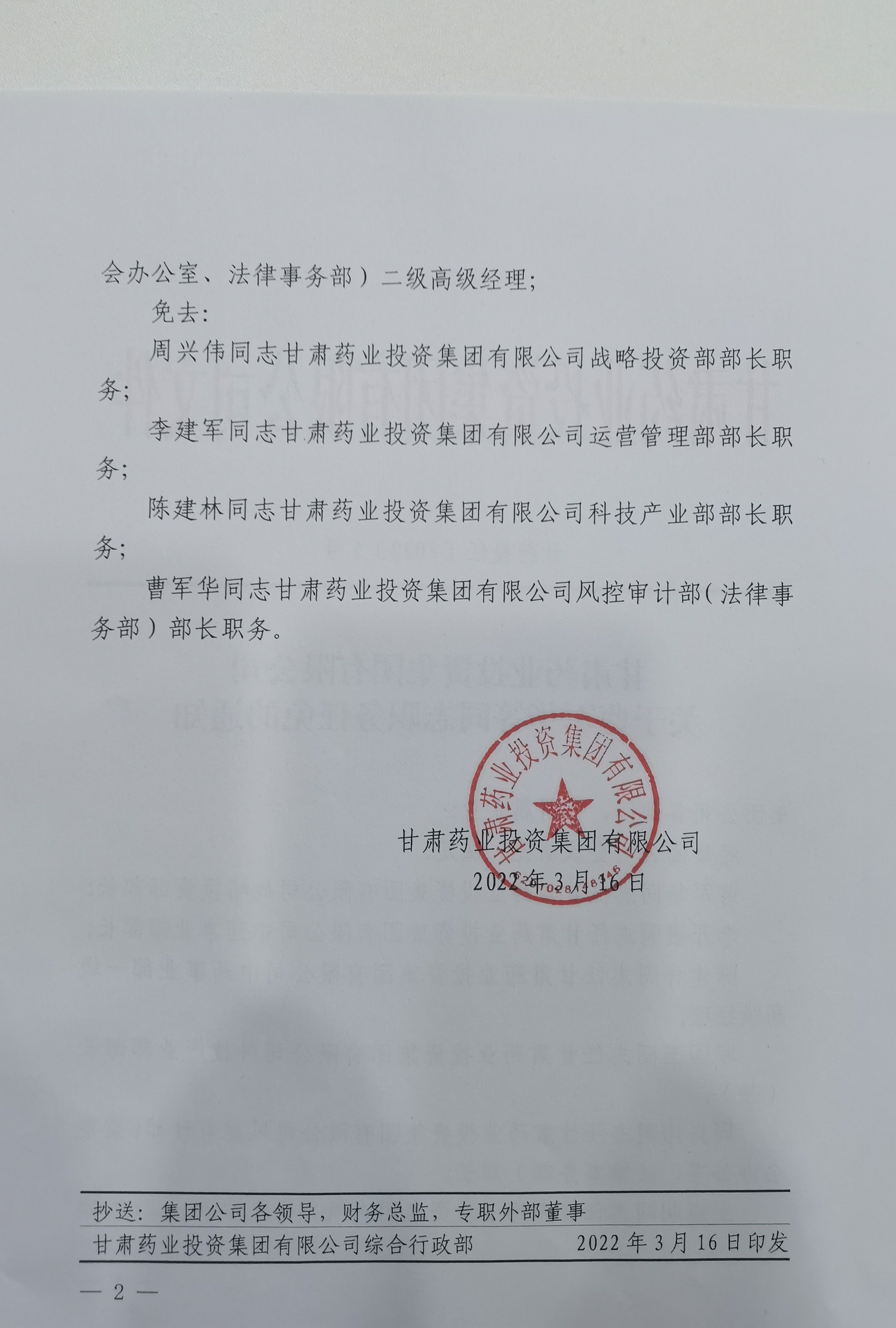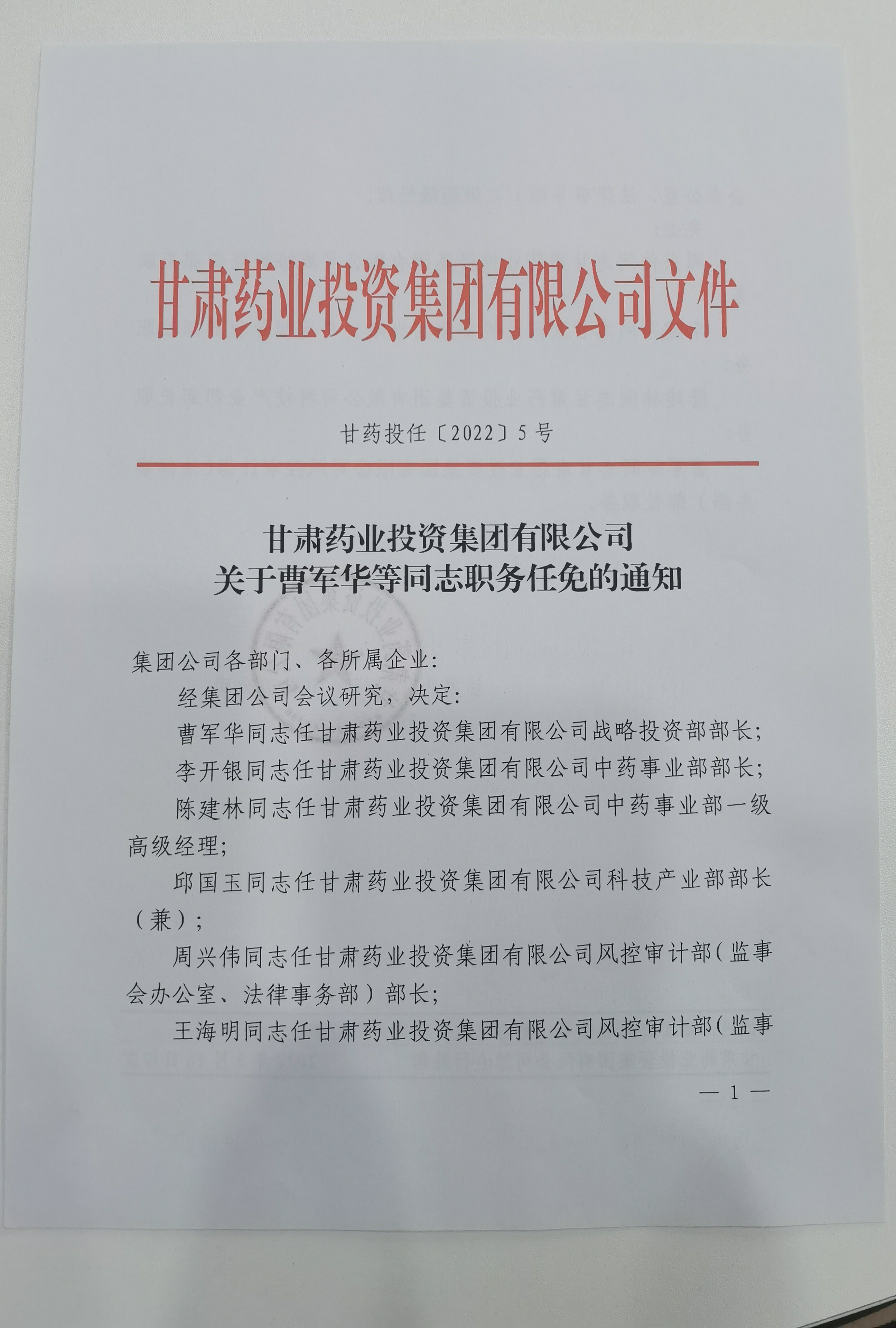 甘肅藥業(yè)投資集團(tuán)有限公司關(guān)于邱國(guó)玉同志職務(wù)任免的通知