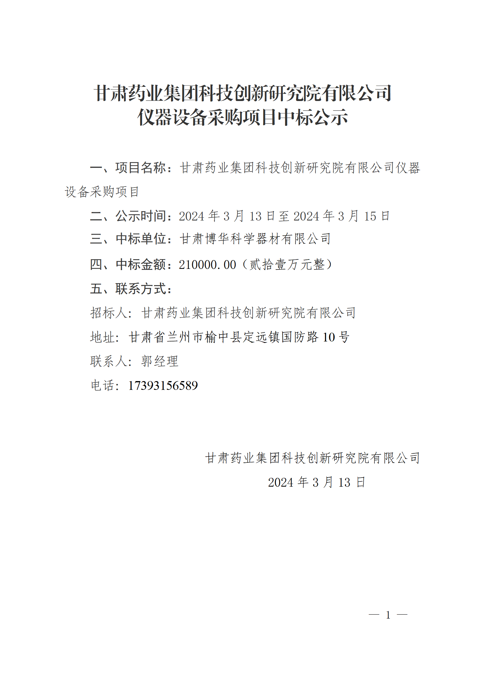 甘肅藥業(yè)集團(tuán)科技創(chuàng)新研究院有限公司儀器設(shè)備采購項(xiàng)目中標(biāo)公示
