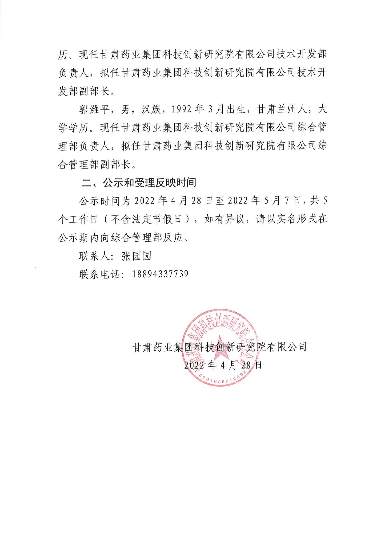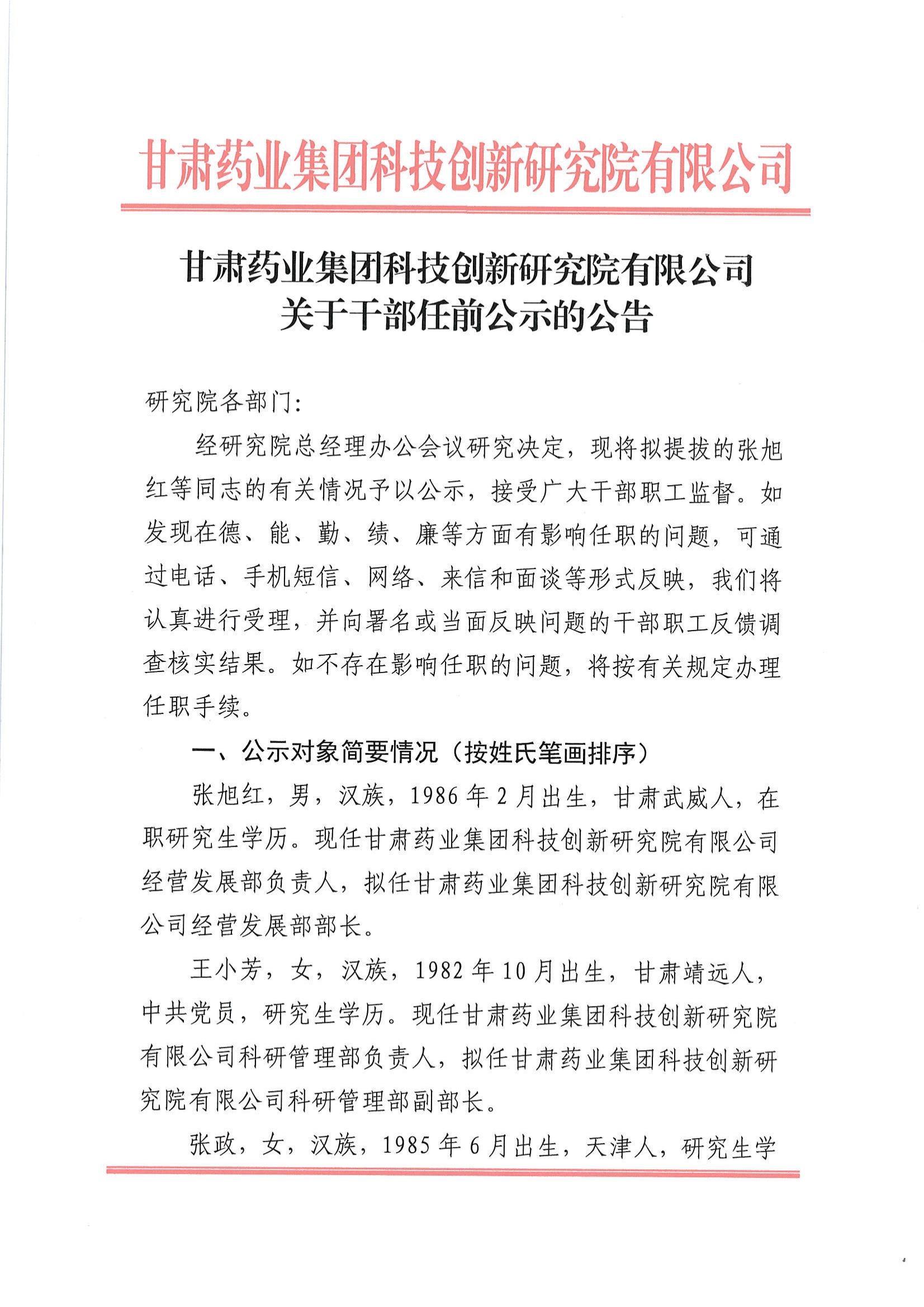 甘肅藥業(yè)集團科技創(chuàng)新研究院有限公司關于干部任期公示的公告